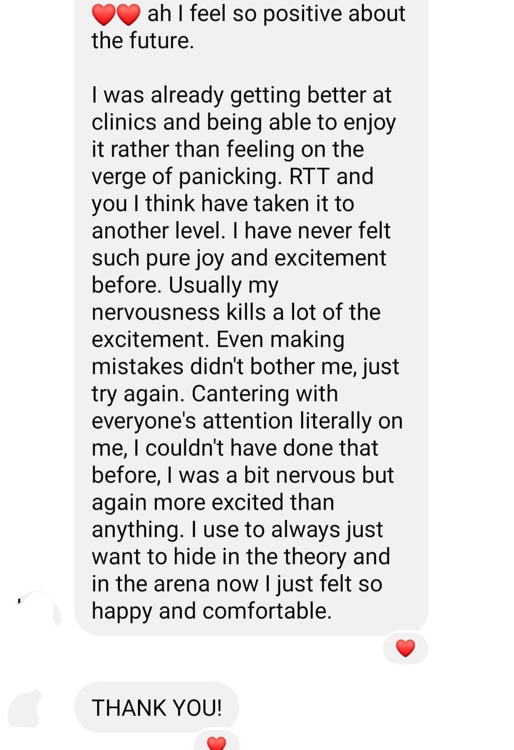 My passion for riding is stronger than it’s been in a long time, and I feel driven to pursue what I truly want. I honestly can't thank you enough, Renae, for helping me rediscover that passion and spark for something I’ve always known is deeply significant to me"